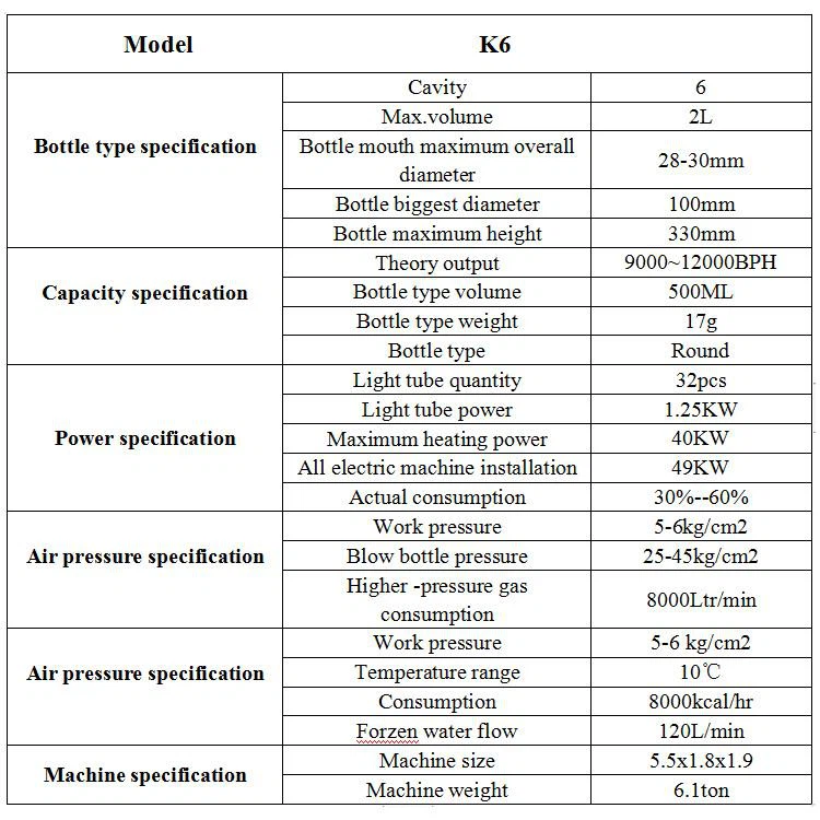বোতল বোতল ছাঁচ মেশিনটি স্টার্ট-আপ এবং ছোট-আকারের সংস্থাগুলির জন্য আদর্শ এবং নির্ভরযোগ্য, ভারী শুল্ক, এবং জল, অ্যালকোহল, রস, তরল ডিটারজেন্ট, উদ্ভিজ্জ তেল, যেমন অনেক শিল্পের জন্য বিভিন্ন মানের উচ্চ মানের পিইটি বোতল উত্পাদন করতে সক্ষম, প্রসাধনী, ওষুধ ও অন্যান্য।